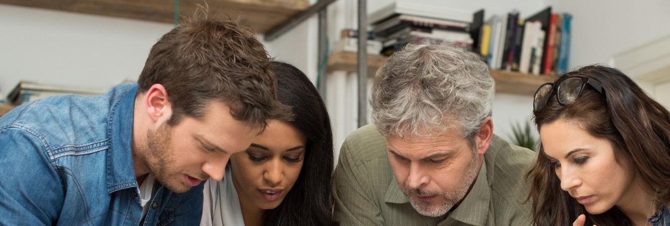 Architects working and discussing on blueprints at office