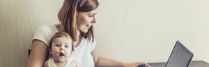 The mother of the woman with the child on hands at work behind the laptop at home